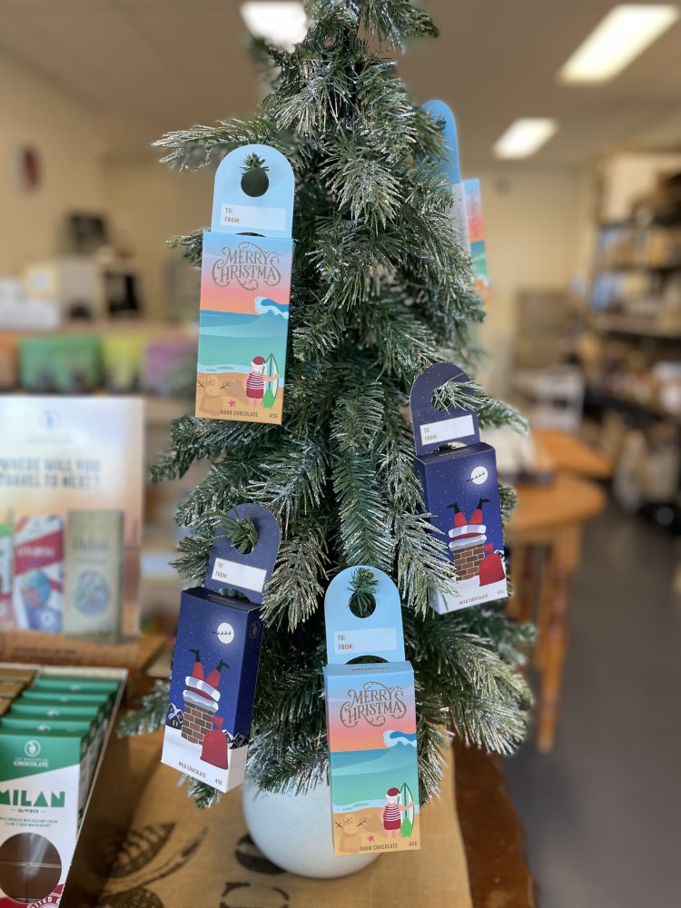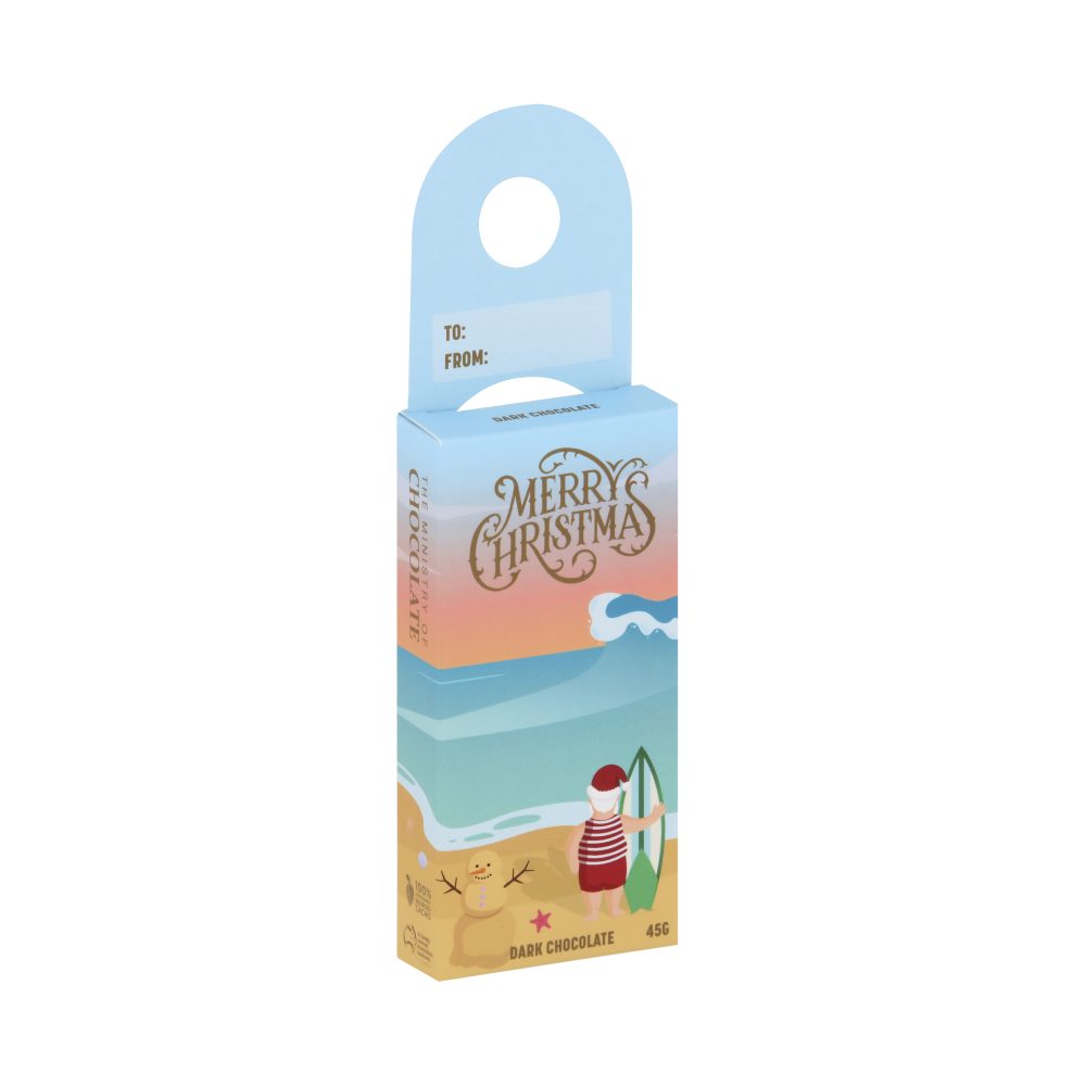 Dark couverture bar in hanging gift box. A deliciously beautiful addition to the tree or bottle of wine.
