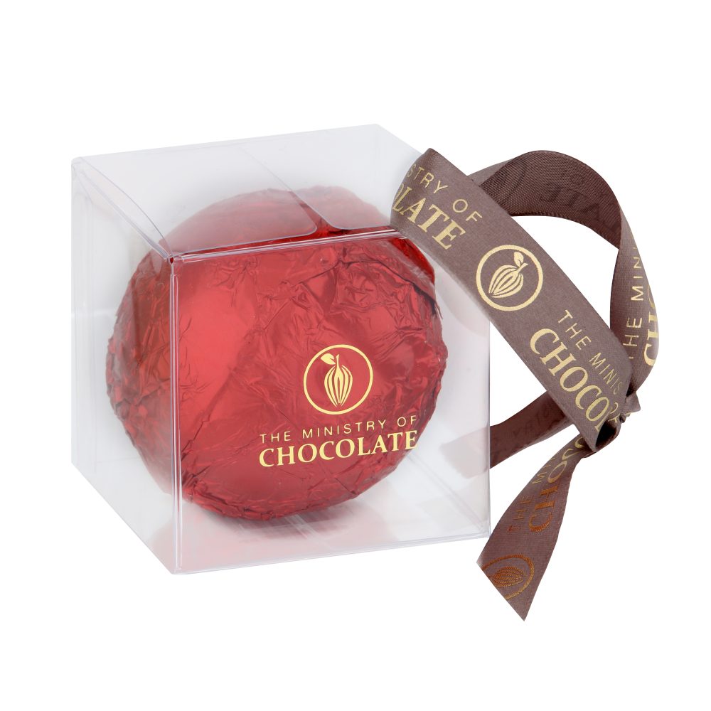 Hollow milk couverture bauble with ribbon to hang on the tree. A cute and delicious decoration.