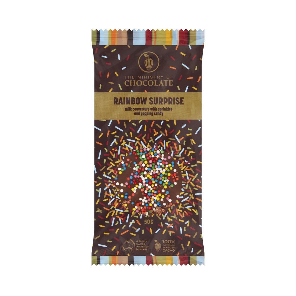 Milk 33% couverture 50g bar with sprinkles and popping candy.