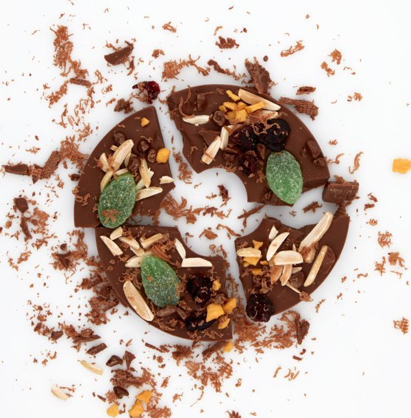 Inspired by Melbourne’s most famous graffiti artwork laneway ‘Hosier Lane’. Milk couverture bar, with coloured chocolate splatters.